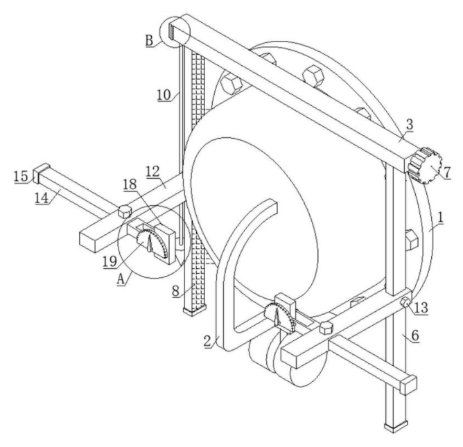 本实用新型公开了一种超压排气活门平衡锤连杆垂直度检测辅助装置,涉及垂直度检测辅助装置技术领域,应用于排气活门本体,排气活门本体端部水平放置有长杆,长杆内部设夹紧组件,夹紧组件包括压板,压板相向或者相离移动用于夹紧或者松开排气活门本体,长杆一端设校准组件,校准组件包括拉绳,拉绳用于检测压板是否垂直,压板外侧面沿垂直方向滑动设置有滑板,滑板内部沿水平方向滑动设置有测量杆,测量杆端部设置有可旋转的转轴,转轴中部设置有校准板,转轴端部设置有弹性指针,测量杆端部外侧设置有角度尺;这样设计的目的是不仅能检测平衡锤连杆是否垂直,还能检测平衡锤连杆与水平面之间的夹角,便于对排气活门本体位置做出调整。