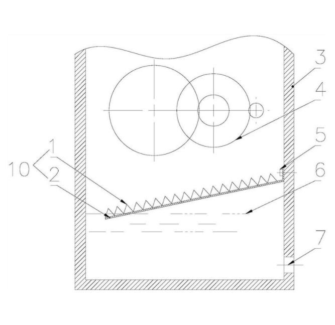 本实用新型公开了一种鼓风机齿轮箱润滑油防发泡装置,包括齿轮箱体和设置在齿轮箱体内的齿轮,在齿轮的下方且位于齿轮箱体底部的侧壁上设置有出油孔,在齿轮箱体内且位于出油孔的上方与齿轮下方之间设置有防发泡板组件,该防发泡板组件的一端固定在出油孔上方的齿轮箱体的内侧壁上,所述防发泡板组件的另一端向出油孔对侧的齿轮箱体的内侧壁方向向下倾斜延伸。本实用新型可将高速运转的齿轮所被甩出的润滑油与防发泡板组件接触,使中高频噪音降噪达到理想效果,在此过程中使润滑油无任何冲击,从根本上解决气泡产生问题,从而防止和消除润滑油在运行使用过程中产生泡沫。