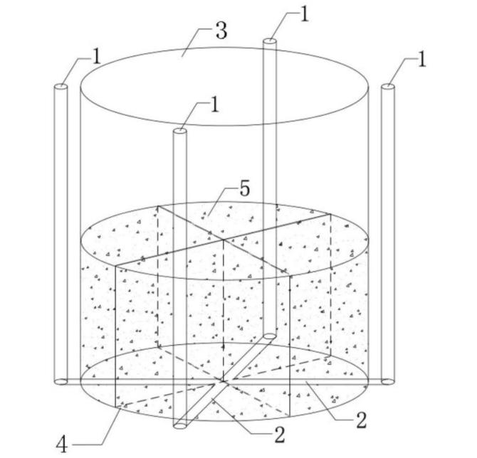 本实用新型涉及一种半柔性路面灌浆料的灌注均匀性评价装置。该装置包括圆管、半圆凹槽、底板和侧板,侧板与底板连接形成敞口容器,底板面板上设置2道相互垂直的半圆凹槽,其两端伸出底板外,敞口容器外侧设置有4根竖直的圆管,半圆凹槽伸出容器外的部分与圆管底部连通,通过将成型好的基体沥青混合料试件沿着轴向分割成四份等体积的扇形体小试件,放入所述的敞口容器进行灌注试验,该装置较为真实地模拟施工现场灌浆料流入基体沥青混合料的方式,可以获得基体沥青混合料沿着轴向的四个方向上的灌注均匀性情况,从而实现评价灌浆料的均匀性,本实用新型可准确、高效、定量地评价灌浆料的灌注均匀性,具有操作方法简单、成本低廉等优点。
