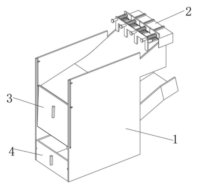 本实用新型涉及线圈收集技术领域,具体地说,涉及一种振动马达线圈收集装置。其包括引导装置,引导装置包括两个侧护板,两个侧护板之间设置有向上弯折的上挡板和用于引导线圈的下接板,上挡板设置在下接板的上侧,上挡板、下接板和侧护板之间为引导腔,下接板的一端固定连接有向上倾斜的用于承接线圈的引导板。本实用新型通过设置的上挡板对切断的铜芯线圈进行阻挡,并通过引导板引导、下接板的承接,使被切断的铜芯线圈被收集在引导装置的内部,使铜芯线圈落在指定的位置,以便于铜芯线圈的收集,进而加快铜芯线圈的包装,进一步的加快振动电机的生产速度。