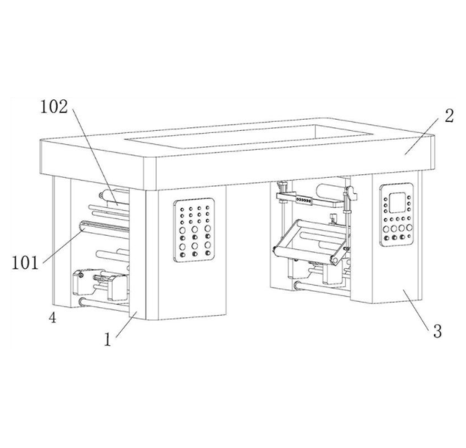 本实用新型公开了一种无溶剂印刷复合装置,涉及印刷加工技术领域。本实用新型包括复合单元、干燥单元和收卷单元,复合单元内侧两端卡接有除尘辊,复合单元内侧中央卡接有涂胶组件,复合单元内侧平行滑接有两个复合压辊,复合单元上侧焊接固定有干燥单元,干燥单元底端相对于复合单元另一侧焊接固定有收卷单元。本实用新型通过复合单元、干燥单元和收卷单元,解决了现有的无溶剂印刷复合装置的涂胶和复合操作之间有一定的时间间隔,胶水长时间接触空气可能出现固化、污染,导致成品质量不佳,基材表面在涂胶之前可能存在一定的灰尘和杂质,灰尘和杂质导致复合效率不佳的问题。