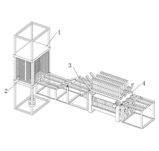 本实用新型公开了一种自动进板装置,涉及机械加工技术领域。本实用新型包括进板组件、进板架、第一传送组件和整理组件,进板组件底端设置有气缸,进板组件内侧卡接有进板架,进板架一侧卡接有伸缩杆,进板组件一侧设置有第一传送组件,第一传送组件一端设置有第二传送组件,第一传送组件和第二传送组件之间设置有整理组件,整理组件外表面卡接固定有支撑板。本实用新型通过进板组件、进板架、第一传送组件和整理组件,解决了现有的进板装置仍需要工作人员将胶合板插入进板装置内,自动化程度不高,生产效率受到限制,一台热压机需要设置两个进板装置,成本较高,厂房内空间利用率较低的问题。