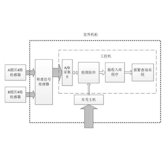 本实用新型公开了专用线货车装载质量检测系统。系统包括室外机模块和安装在钢轨上的称重模块,室外机模块包括工控机、称重信号处理器、车号主机和显示器,称重模块与称重信号处理器连接,称重信号处理器、车号主机和显示器分别与所述工控机连接。本实用新型采用成本相对较低、安装方便、适于普通货运站和专用线推广使用的检测装置,从装车源头站开始检测卡控,可以最有效地防止超、偏载车辆上线运行,保障货运装载安全。
