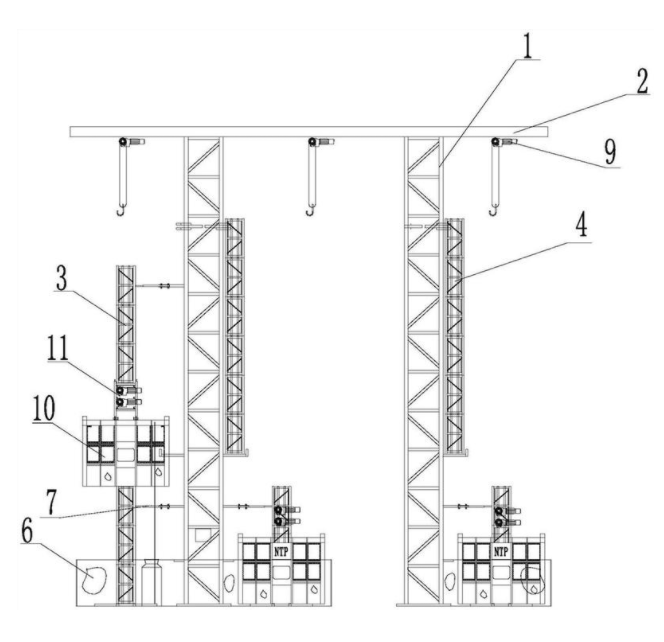 本实用新型公开了一种施工升降机规模化专用调试台,包括塔身主立架、主导轨架、拆装式导轨架、附着装置、吊笼、传动机构及行车,所述主导轨架通过附着装置与塔身主立架连接,所述吊笼设置于塔身主立架的一侧,所述传动机构设置在吊笼的上方,所述行车水平架设于所述塔身主立架的顶部,所述拆装式导轨架可拆装设置于塔身主立架旁。本实用新型的施工升降机规模化专用调试台,在使用时,将吊笼及传动机构安装进拆装式导轨架后,将拆装式导轨架连接在主导轨架上方增加调试高度,移动式通电箱与吊笼电连接进行通电调试,具有模块化、安全性好、互换性高等特点。