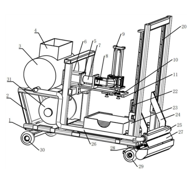 本实用新型公开了一种自动化瓷砖粘贴设备。设备包括底座,底座上侧设有支架,支架的一端上设有搅拌机构,搅拌机构的下方设有气源,搅拌机构的前方设有吸取机构,气源与吸取机构连接,吸取机构的下方设有用于储存瓷砖的储砖机构,瓷砖机构的前方设有升降机构,升降机构与支架远离搅拌机构的一端连接,升降机构上连接有抹浆机构,抹浆机构与所述搅拌机构连接,底座的下侧设有移动机构。本实用新型在粘贴瓷砖的过程中无需人工参与,自动化程度高,不仅提高工作效率,而且还能回收旧料,既环保,又节约材料。