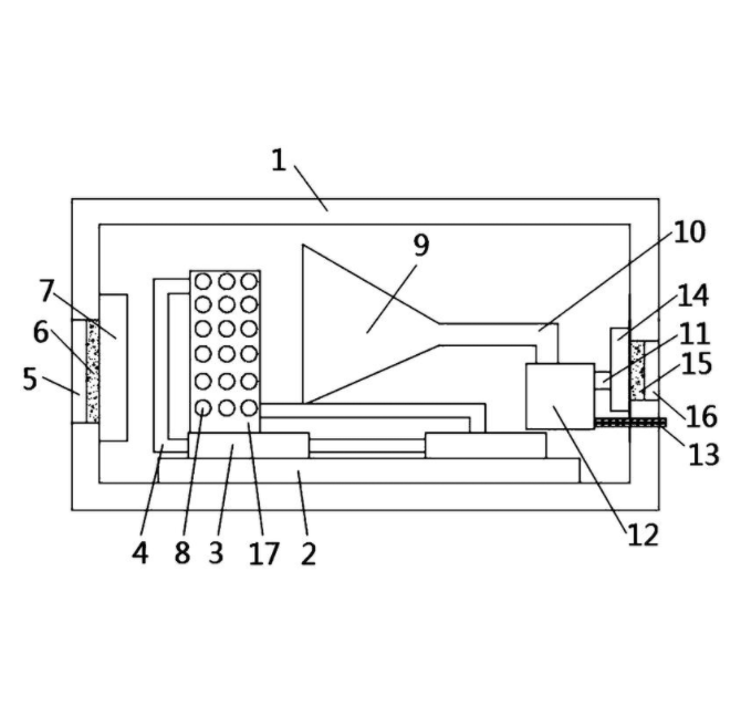 本实用新型涉及配电箱技术领域,尤其为一种配电箱的散热结构,包括:配电箱体、电子元件、散热器底座、吸热管、进气口、过滤网一、风扇一、散热孔、导流槽、抽气管一、抽气管二、集尘箱、拉杆、风扇二、过滤网二、出气口、集热棒、过滤网三、收尘盒,配电箱体的内部底端上面设有电子元件,电子元件的上端设有两个散热器底座,两散热器底座之间设有吸热管,左侧的散热器底座左端连接有竖直放置的吸热管,右侧散热器底座的上端连接有水平放置的吸热管。