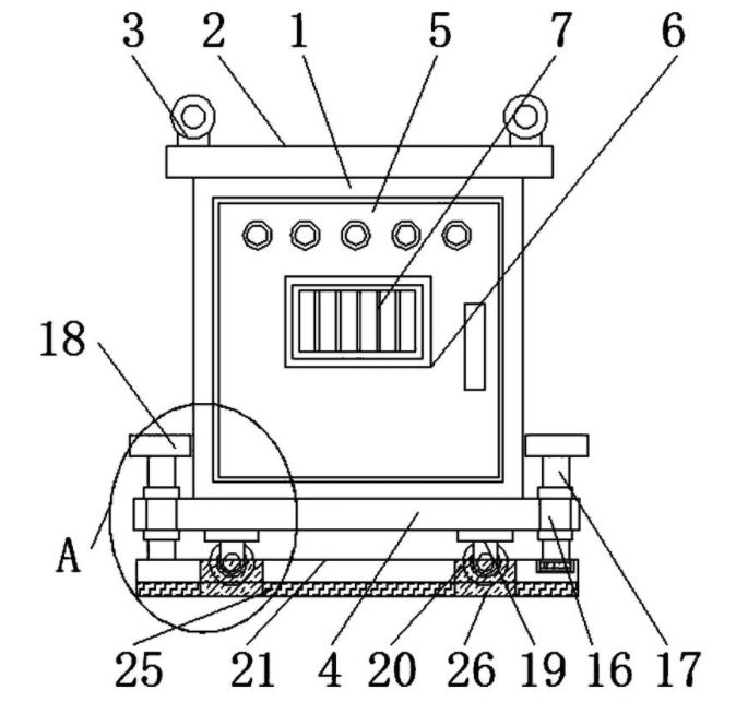 本实用新型公开了一种室内配电柜,包括柜体,所述柜体的下表面设置有底板,且柜体的前壁设置有柜门,所述柜门的前表面中间位置设置有电气箱,所述柜体的后表面垂直焊接有挡罩,且挡罩的纵截面形状为矩框形,所述挡罩的后表面设置有固定板,且固定板的前后表面底部位置之间均匀设置有若干组接线柱,所述挡罩的两侧壁位置均开设有若干组导风孔,位于同一侧若干组所述导风孔均匀分布,所述柜体的后壁顶部中间位置垂直设置有定位管。本实用新型提供接线固定空间阻隔外界环境灰尘干扰,并和设置的排风导热结构相配合,增强散热性能,同时,设置的支撑体可增强配电柜在室内安装的稳固性且放置高度调节方便,适合广泛推广与使用。