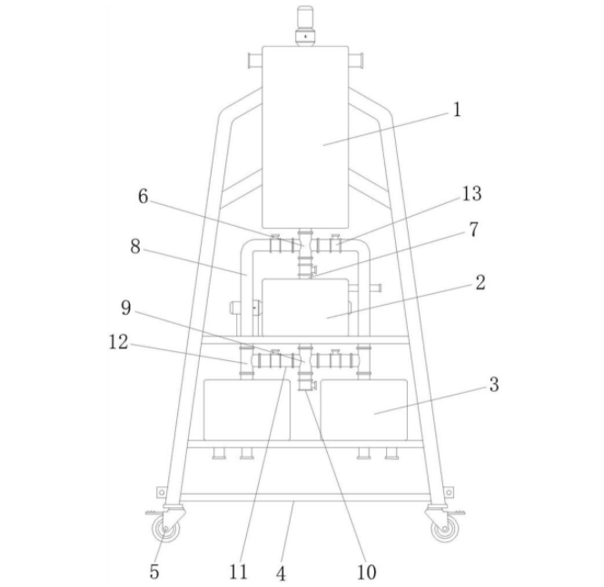 本实用新型公开了一种蕉科植物萃取用分离装置,涉及分离设备技术领域。本实用新型包括第一萃取筒、第二萃取筒和分离筒,所述第一萃取筒、第二萃取筒和分离筒均固定在支撑架上,所述支撑架的底部设置有带刹万向轮,带刹万向轮的设置使得该装置便于移动,所述第一萃取筒设置在第二萃取筒的上方,所述分离筒设置有两个,两个所述分离筒对称设置在第二萃取筒的下方,所述第一萃取筒的底部出口固定有第一四通。本实用新型通过设置第一萃取筒、第二萃取筒和两个分离筒,二级萃取的设计使得该装置的萃取精度得到大大提高,双分离筒的设计使得该装置的分离效果得到大大提高,不同液相采用不同的分离筒进行分离,避免两种液相混合。