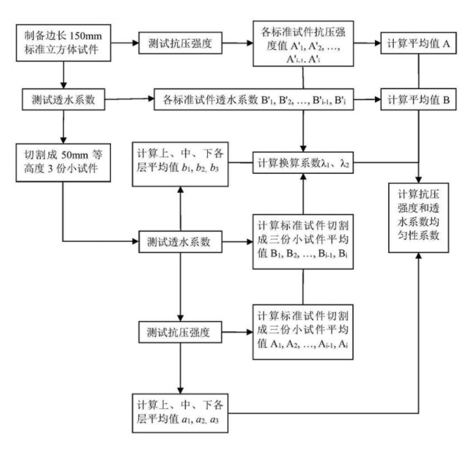 本发明公开了一种透水混凝土抗压强度与透水系数均匀性评价方法,包括(1)制备标准试件,(2)对标准试件进行透水试验和抗压强度试验,(3)将经过透水试验的标准试件切割成小试件后再次进行透水试验和抗压强度试验,(4)计算换算系数,(5)计算评价透水混凝土抗压强度与透水系数均匀性。本发明的方法直接以透水混凝土关键性能强度和透水系数为评价指标,解决了均匀性评价指标体系强度和透水系数分离的弊端,达到了透水系数测定标准试件和切割小试件同源,以及切割小试件的抗压强度和透水系数同源,采用了量化的均匀性系数指标,该评价方法科学可靠、操作过程简单、技术成本低,能够快速得出评价结论,具有良好的工程应用前景和推广价值。
