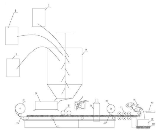 本实用新型公开了一种轻质防护门加工生产线,包括传送支撑架,在传送支撑架的首端设置多个分料筒,在传送支撑架的首端上方设置混料筒,每个分料筒通过输料管与混料筒连通,在传送支撑架上铺设传送料带,在传送支撑架的首端侧上方设置下托膜辊,在混料筒下方且靠近托膜辊一侧设置分料槽装置,该混料筒的出料口与分料槽装置的入料口连通,在混料筒下方且远离分料槽装置一侧的传送料带上方设置挤压辊,在传送支撑架的末端侧上方设置上托膜辊,在上托膜辊与上挤压辊之间的传送支撑架上方设置纤维切断装置,在靠近传送支撑架的末端且设置复合碾压辊组。本实用新型能对轻质门的各个工序进行有效衔接,实现自动化流水生产作业,减少了人工操作环节。