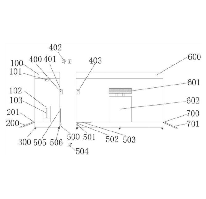 本实用新型公开了一种大空间的双人通行人脸测温通道,涉及公共卫生技术领域。本实用新型包括测温箱体、活动滚轮、箱体连接插板、底部连接插板、消毒箱体,测温箱体底部固定连接有活动滚轮,活动滚轮通过固定轴承基座固定在测温箱体底部与消毒箱体底部,固定轴承基座通过带孔支架活动连接活动滚轮,带孔支架与轮毂插孔通过轮毂插销固定,测温箱体后部两侧固定连接有箱体连接插板,测温箱体后部底端固定连接有关于中心对称的两个底部连接插板,测温箱体通过箱体连接插板、底部连接插板与消毒箱体固定,本实用新型通过设置活动滚轮、箱体连接插板、底部连接插板解决了大型测温通道安装不便,体积过大运输不便,安装后不便做出调整的问题。