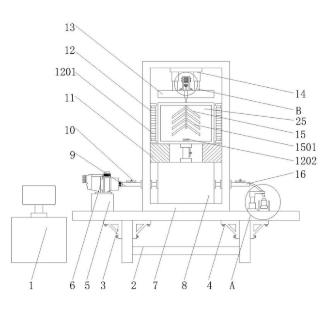 本实用新型公开了一种眼药水的生产系统,涉及保健型药物技术领域。本实用新型包括储液罐、恒温机构、搅拌机构和配液罐,恒温机构包括的加热棒固定连接在安装架内部两侧,且加热棒之间设置有配液罐,配液罐内部底端固定连接有温度传感器,且配液罐设置在托块上侧,托块固定连接在安装架两侧中央位置,且安装架内部底端设置有储液罐,储液罐与配液罐之间贯穿连接有连接管,且连接管外侧固定连接有电磁控制阀,搅拌机构包括的伺服电机一端固定连接有轴杆,且轴杆通过联轴器转动连接有转杆,转杆一端外侧固定连接有搅拌棒。本实用新型通过设置恒温机构和搅拌机构,具有提高眼药水本体配制效率以及便于控制眼药水本体配制过程中液体温度的优点。