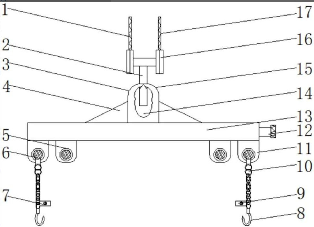 本实用新型公开了一种电缆线盘吊具,包括支撑板,所述支撑板的顶部设置有加强连接组件,所述支撑板的内侧开设有导向槽,所述导向槽的内侧通过转轴转动安装有调节杆。该一种电缆线盘吊具,可根据实际电缆线盘规格型号和体积不同的需要,通过人工扭动握把带动调节杆进行实时转动,通过调节杆表面两侧的正反螺纹驱动滑块向相对或者相背的方向进行实时移动,从而实现对锁链和挂钩之间的距离实时调节,使挂钩和锁链能够与电缆线盘的两侧相互对应,避免需要增加锁链长度和使锁链发生一定倾斜才能与电缆线盘两端进行连接,消除了吊运过程中锁链受到的水平两侧的拉出力,防止了吊运过程中出现脱钩隐患。