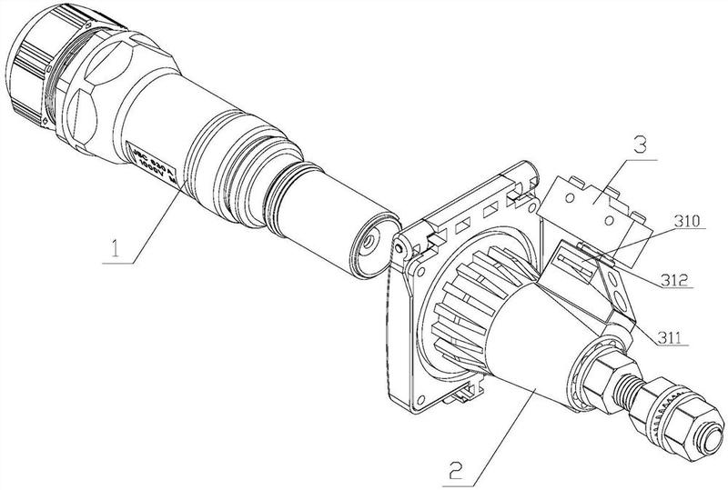本实用新型公开了一种大电流连接器装置,包括插头以及与插头相互配合插接的插座,在插座的外壁上设置有插入插座内部的微动开关,微动开关包括开关本体、开关底座和按钮插杆,插头包括插头壳本体和金属插接部,该插头壳本体具有一体成型的电源线接入部和绝缘筒插入部,金属插接部一体成型贯穿固定在电源线接入部和绝缘筒插入部内,插座包括插座壳本体、相互连接且一体成型的金属插座筒连接部和电源线接出部,金属插座筒连接部设置在插座壳本体内且与该插座壳本体的内壁形成插接腔体,微动开关的按钮插杆依次从开关底座的外壁插入插座壳本体和插接腔体内。本实用新型可以快速地进行插接从而完成充电传输或电缆转接并能够及时确定是否插接到位。