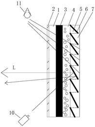 本实用新型公开了一种菲涅尔抗光投影幕,所述抗光投影幕包括基材层、表面抗划伤层、着色层、扩散层、菲涅尔透镜层和吸光层,在所述基材层的表面设置所述表面抗划伤层,在所述基材层的背面依次向后设置所述着色层、扩散层、菲涅尔透镜层和吸光层,所述菲涅尔透镜层的断面为接近90°的连续三角形锯齿纹理结构;其制造方法为通过共挤、挤压形成柔性可卷曲基材层,通过涂布或喷砂工艺覆着一层表面抗划伤层;通过精密模具模压或滚压、固化成型菲涅尔纹理结构,在菲涅尔透镜层表面覆盖一层致密的反射层和吸光层。本实用新型可有效解决反射层与菲涅尔纹理层不能很好搭配的问题,有效提高了菲涅尔屏幕的增益以及抵抗环境光的功能。