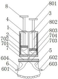 本实用新型公开了一种便于定量涂抹护理用涂药装置,包括针管,所述针管的内部分别设置有膏体仓和液体仓,所述膏体仓和液体仓的表面皆设置有刻度线,所述膏体仓和液体仓的内部皆设置有推动组件,所述针管的底部设置有安装组件,所述安装组件的底部活动安装有壳体,所述壳体的内部设置有功能头组件。该一种便于定量涂抹护理用涂药装置通过观察膏体仓和液体仓表面的刻度线,可以详细的观察到当次所涂抹的量,有效的防止了因用量过度导致对皮肤和身体的伤害,该装置通过按摩头可对膏体导流头挤出的膏体进行揉搓按摩,使膏体可以更加均匀的涂抹在皮肤上,使皮肤更加容易吸收,同时避免了用手直接接触膏体。