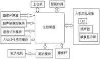 本实用新型公开了一种智能预警助行器,图像传感器采集指定运行路线的图像信息,超声波测距模块采集助行器与障碍物之间的间距,根据该图像信息和间距综合分析和判断,通过驱动模块控制驱动电机运行,从而控制助行器准确、稳定地行驶;该助行器不仅可以通过操作杆操纵其行驶,还可以通过语音识别模块获取使用者的语音指令,通过语音指令来操纵其行驶,更便于高度残障人士或不熟悉手动操纵者的使用;通过人体红外感应模块可以监测使用者体温等身体状况,当体温等身体状况异常时,传输给上位机,便于及时发现身体异常情况;人机交互设备用于在异常时发出语音警报,以及显示身体状况参数等。