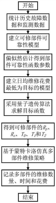 本发明公开了一种地铁车辆转向架多部件预防性维修决策优化模型,包括对转向架中多部件发生故障的概率采用基于可靠性的状态?机会维修模式优化模型进行监测,对可修部件的故障率建立数学模型,并对该数学模型参数进行估算;建立可修部件日均维修花费最低作为目标函数的数学模型;采用智能算法对目标函数的数学模型进行优化搜索出最优值,再利用决策变量之间存在的相关性求解可修部件的可靠度阈值;采用蒙特卡洛模拟列车多部件维修策略,并获取和记录各列车部件的维修方式、维修数量、维修时间以及维修花费;本发明能够在满足列车部件运行可靠性的基础上提高列车利用率、降低维修成本,为地铁列车维修模型优化研究提供了参考与理论支持。