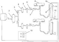 本实用新型公开了一种空压机粉料输送装置,属于粉料输送技术领域,包括空压机、大储气罐、手动止回阀、小储气罐、水分离器、电磁阀、手动开关阀、粉料输送车、粉料罐、除尘器、料位计和PLC控制器。通过在空压气体的管道上设置了水分离器,会直接对管道内的空气进行水分离,使得通入粉料车内的空气更加的干燥,同时在大储气罐内设置了除水板,在大储气罐内先进行一次水分离,使得后续的水分离器分离后的空气更加的干燥,在粉料罐顶部设置除尘器,使得过滤除尘的效果更好,使得输出的空气符合国家排放标准的要求。