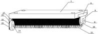 本实用新型公开了一种公交车门用方便高效底部清理毛刷,包括主支撑底板,所述主支撑底板的底面横向开设有滑动卡槽,所述滑动卡槽在靠近主支撑底板的开口端内侧壁对称开设有顶接卡位槽,所述滑动卡槽的内侧水平卡接有支撑滑动板,所述支撑滑动板的一端两侧边对称开设有隐藏凹槽,所述隐藏凹槽的内侧卡接有支撑弹簧,所述支撑弹簧在远离隐藏凹槽的一端对接有顶接钢珠,所述支撑滑动板的底面靠近两端位置对称垂直向下焊接有固定支撑块,所述固定支撑块的中间位置插接有轴承杆。本实用新型多重的机械结构的连接,使得装置设置简单,传动更加的高效快速,安装方便快捷,且在不需要另外的动力的作用下进行滚轮是清扫,使得清扫效果更佳且效率更高。