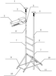 本实用新型公开了一种免支架安装的水钻登高作业装置,属于水钻登高作业辅助装置领域,包括方形钢板、调节圆孔、卡扣、可调节顶托、上端立柱、底端立柱、横杆和三角撑。若干条横杆固定设置在两根底端立柱之间,上端立柱可伸缩的套设在底端立柱内,若干个调节圆孔设置在上端立柱上,可调节顶托可调节设置在上端立柱的顶部。该方案就地取材,成本低廉,制作方便,操作简单,易于工人使用,全套装置的各个零部件均采用榫卯结构,安装、拆卸都极为方便,装拆速度快;各构配件重量小、长短适中,便于携带和搬运;作业前无需打孔安装水钻固定支座,优化了工序,对墙面没有损伤,最大程度上保留了室内装修原貌,节约了成本。