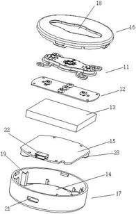 本实用新型公开了一种基于石墨烯带有理疗功能的低频仪,包括主机、电极片和海绵片,所述主机和电极片的中间均设有位置对应的通孔,所述海绵片固定在在通孔内,主机和电极片之间设有连接件,所述主机为中空壳体,该中空壳体内设有按钮PCB板、主机PCB板、电池、石墨烯膜片和膜片压板,所述中空壳体包括壳盖和壳壁,所述壳盖固定在壳壁的上部,该壳盖上设有按钮通孔,所述按钮PCB板、主机PCB板、电池、石墨烯膜片和膜片压板贴合设置在中空壳体内部。本实用新型能够产生高能远红外线6?14μm辐射,与人体红外线几乎同频,可以有效作用于人体细胞,产生共振,促进人体新陈代谢,从而达到理疗效果。
