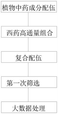 本发明公开了一种植物复配的智能筛选方法,包括植物中药成分配伍、西药高通量组合、复合配伍、第一次筛选和利用大数据处理第二次筛选。本发明植物复配的智能筛选方法有机地融合了中药方剂配伍规律和西药组合式高通量筛选平台技术的理念精华,在技术上多层面地创新突破,经过多轮筛选,精准定位配方中各植物提取物的使用剂量,并将其机理机制研究深入到分子、细胞生物学水平。