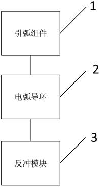 本实用新型公开了一种引弧装置,属于防雷灭弧技术领域,包括引弧组件和电弧导环,所述引弧组件设置在电弧导环上,所述电弧导环设置在外部的反冲模块上。电弧导环设置为金属圆环,金属圆环设置在反冲模块的顶端。本实用新型设置的多种结构的引弧装置,用雷电先导在引弧装置表面感应聚集的大量异性电荷,故此装置上聚集的大量异性电荷(正离子)对雷云上的电荷(负离子)存在强大库仑力,因此,电荷能更稳定地停留在装置表面,增强装置的引雷效果。