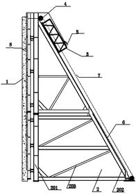 本实用新型涉及一种高大侧墙防水混凝土振捣装置,包括侧墙模板,所述侧墙模板上设置有驱动机构以及由驱动机构驱动的移动架,所述移动架上连接有多个振动机构,所述侧墙模板的结构形状为直角三角形,该侧墙模板的倾斜杆所在的倾斜平面上开设有导向滑槽;所述驱动机构包括驱动电机及传动带,所述传动带设置于导向滑槽内,所述移动架的一端设于导向滑槽内,并设置于传动带的上方,所述驱动电机设置于侧墙模板上并带动传动带传动。本实用新型安装快捷方便,整体稳定性好,机械化程度高,工人劳动强度低,施工周期短;地铁高大侧墙防水混凝土效果极佳,具有工程质量预控、施工安全、快速安装等优点。