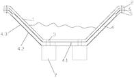 本实用新型公开了一种用于尾矿库库面自适应装配式排水渠道,属于尾矿库环保领域,所述排水渠道由若干段排水渠单元组成,排水渠单元设置为凹槽结构,排水渠单元与排水渠单元之间可拆卸连接,所述排水渠道设置在尾矿库的泥浆上,且陷入泥浆。排水渠单元包括抗老化层、防渗层、填充孔、自重调节装置、锚固螺钉和填充囊。通过沉降调节系统下沉至最终固结底标高,进行库面排水,排水渠道采用内压防渗层铰接装配式设计,能快速更换防渗层的同时,能有效避免泥浆不均匀固结过程导致的渠身应力集中造成的渠身破坏。在达到最终固结高度后,渠道作为永久排水设施使用,能够快速、经济的解决在流塑状库面排水问题。