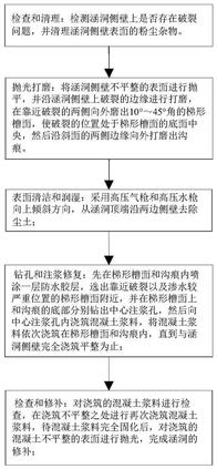 本发明公开了一种涵洞修补方法,包括检查和清理,检测涵洞侧壁上是否存在破裂以及渗水问题,并清理涵洞侧壁表面的粉尘杂物;抛光打磨,将涵洞侧壁不平整的表面进行抛平,并沿涵洞侧壁上破裂的边缘进行打磨;表面清洁和润湿,采用高压气枪和高压水枪向上倾斜方向,从涵洞顶端沿两边侧壁去除尘土;钻孔和注浆修复,先在梯形槽面和沟痕内喷涂或刷涂防水胶层,选出靠近破裂以及渗水较严重位置的梯形槽面附近,并在梯形槽面上和沟痕的底部分别钻出中心注浆孔;检查和修补,对浇筑的混凝土浆料进行检查,在浇筑不平整之处进行再次浇筑;本发明的修补方法能使修补后的颜色与原混凝土保持统一,能保证涵洞混凝土的密实性、防风化和浸浊能力。
