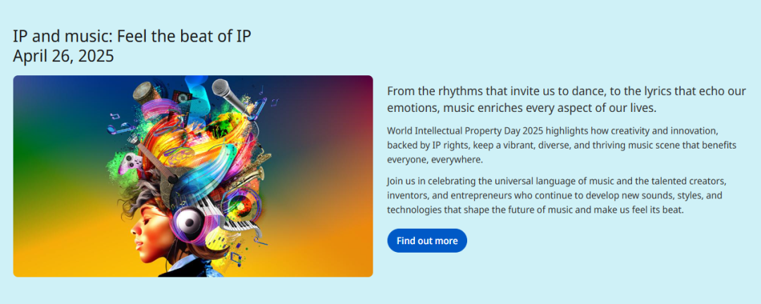 世界知识产权组织(WIPO)在官网发布了2025年世界知识产权日主题:知识产权与音乐:感受知识产权的律动 IP and music: Feel the beat of IP(注:中文主题请以WIPO中国发布为准)。