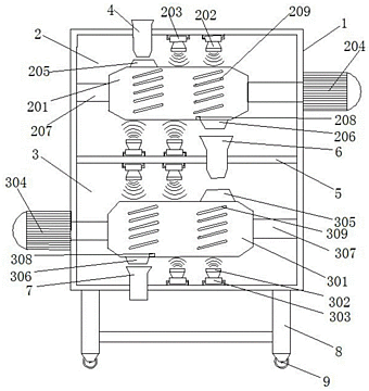 本发明公开了一种微波干燥设备及其使用方法,通过驱动电机驱动加热滚筒转动,在加热过程中,通过加热滚筒的转动带动物料不停地做翻滚运动,使物料受热均匀;多个微波发生器分布于加热滚筒的周向,使加热滚筒受热均匀,从而进一步使物料受热均匀;温度检测模块用于检测加热滚筒内的温度,从而控制微波发生器的微波辐射能量大小;水分检测模块用于检测加热滚筒内物料的水分,当水分达到设定值时,该加热滚筒停止转动,将物料通过第二进料斗转移至下一个干燥单元继续处理,而该干燥单元可以处理新物料的加热,通过该微波干燥设备可以同时处理多批物料的干燥,大大提高了干燥效率,节省了干燥时间。