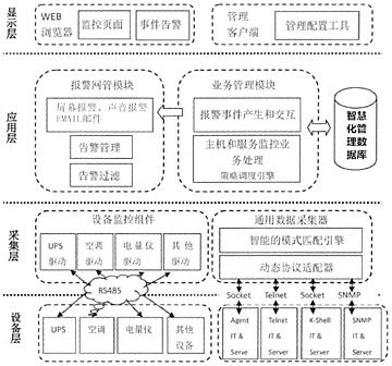 本发明公开了一种校园网机房数据中心机房自动管理系统,属于自动管理领域,包括显示层、应用层、采集层和设备层。通过传感器监控机房环境数据,并通过自动控制的方式解决机房出现意外突发情况,可以更好解决了现有人工检查所存在的缺陷,实现系统报警的及时性、高可靠性,实现全天候、不间断地实时监控管理学院校园网数据中心机房,以将数据中心机房的实时情况推送给网络中心机房管理教师,教师可以通过计算机、手机或平板电脑等设备上方便及时管理机房,达到预警管理的目的,并通过红外温度检测的方式对机柜内的设备进行实时的而检测,当出现故障时,可以快速的感知并定位,是的管理可以快速的更换等,更好的维护了机房的实时性。