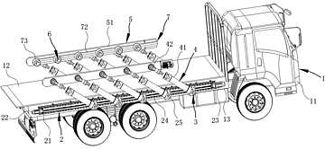本发明公开了用于钢筋混凝土管的随车式自动化运输装卸及安装设备,属于挂车运输设备技术领域。包括平板货车结构、往复直线驱动结构、调向回转电机、多级伸缩结构、定位安装结构、调节夹持结构、自适应调压结构;该系统能够通过在平板货车结构沿其前进方向的两侧分别设置定位安装结构,并分别经往复直线驱动结构、调向回转电机和多级伸缩结构调节定位安装结构的横纵向位置以及朝向,使得调节夹持结构和自适应调压结构能对应到达平板货车结构内部任意装运钢筋混凝土管的位置,并且能到达平板货车结构外部的位置,以此实现对平板货车结构内外部的钢筋混凝土管进行相互运输,进而完成对钢筋混凝土管在平板货车结构的装运、卸运及卸运后的安装过程。