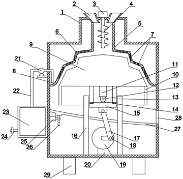 本发明涉及环保废弃物处理领域,具体是一种用于固体废弃物环保处理的装置,包括分离结构,通过分离结构将固体废弃物中的固体和液体分离,其中分离结构包括挤压板和旋转座,本发明通过升降结构带动旋转座与挤压板接触挤压分离固体废弃物内含有的液体,挤压板上用于过滤分离的液体的过滤件,旋转座和挤压板均设置为多层阶梯式,经过上一层分离作业的固体废弃物输送至下一层再次分离,该装置还设有用于收集液体的收集结构和用于输送固体废弃物的输送结构,避免了现有固体废弃物液体收集常通过一次进料进行挤压分离,在分离后再分别收集其中的固体和液体后进行下次的进料分离作业,无法通过分离装置进行连续不间断进料作业,降低了作业的效率。
