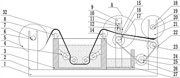 本发明涉及纺织印染领域,公开了一种纺织印染用主动排水式水洗箱,包括底板,底板中部固定连接水洗箱,底板左侧固定连接第一立柱,第一立柱上部设有第一转动槽,第一转动槽固定连接放卷轴,放卷轴固定连接放卷辊,放卷辊缠绕布料,水洗箱左侧板顶部转动连接第一导向辊,水洗箱左右两侧内壁铰接张力框。本发明适用于纺织生产活动,通过将布料完全浸没在水洗液中,并且配合张力辊提高清洗效果,清洗完毕之后通过第一压力辊和第二压力辊主动将布料中的废液排出,整个清洗和收卷过程中一直保持布料的张力,防止布料出现褶皱等问题,并且设置有压力传感器可以提醒操作人员更换布料,整个装置操作简单智能,适宜在实际生产中推广使用。