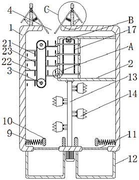 本发明涉及水果加工技术领域,且公开了可进行水果去核预粉碎的榨汁前处理装置及其使用方法,包括外壳一、外壳二和齿轮一,所述外壳一的顶部表面开设有进料孔,外壳一的顶部固定连接有进料管,进料管的外部固定连接有伸缩杆,伸缩杆的顶部活动连接有转板,进料管的内侧固定连接有弹簧一,外壳一的内部固定连接有弹簧二;通过进料孔、进料管、伸缩杆、转板、弹簧一之间的相互作用下,通过调节伸缩杆,进而可以调节转板连接有弹簧一的底端的角度,这样就可以使机器在进行果类分类时,挑选出最适合榨汁形状的水果,并且可以通过伸缩杆的小幅度伸缩,可以使转板不断的震动,这样就可以避免由于水果过多导致的进料口的堵塞。