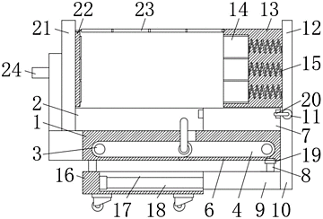 本实用新型公开了一种建筑施工用运输装置,涉及建筑施工设施技术领域,包括支撑座,所述支撑座的顶部固定连接有放置板,所述支撑座的正面转动连接有支架,所述支架背面的右侧转动连接有连接架,所述连接架背面的右侧固定连接有移动杆,所述移动杆的表面活动连接有横板。该建筑施工用运输装置,通过设置挡板、圆槽、伸缩弹簧和橡胶板,管道材料的右端位于圆槽的内部,使得管道材料运输时不会发生前后方向的晃动,橡胶板和挡板位于管道材料的左右两侧,通过橡胶板和圆槽右侧伸缩弹簧对管道材料的弹力作用,减小了管道材料对左右侧板的碰撞,从而防止左右侧板发生形板,进而便于管道材料的运输。