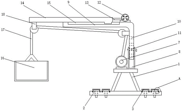 本实用新型公开了一种建筑吊篮起吊设备,包括底座、驱动电机和所述支架,所述底座的上方另一侧设置有支架,所述底座的下方两侧均贯穿有螺纹杆,且螺纹杆的外侧设置有保护套,所述保护套的下方与卡槽配合安装,且卡槽开设在底座的底部上表面,所述驱动电机设置在底座的上方一侧,且驱动电机的前方安装有转轴,同时转轴的前方固定有滚轮,所述支架的上方设置有活动架,且活动架的表面开设有插孔,同时插孔的内部贯穿有插销,所述活动架的上方一侧安装有液压缸,且液压缸的一侧固定有液压杆。本实用新型,简化的吊篮起吊设备便于对起吊设备的高度进行调节,且便于对吊篮的伸出位置进行调节,使得该起吊设备能适应各种建筑环境。