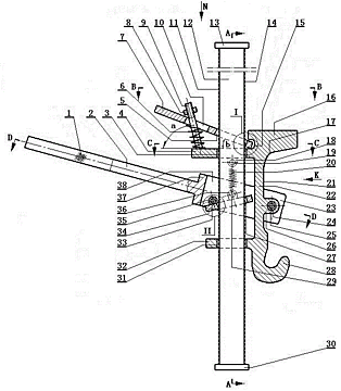 本实用新型公开了一种使用方便的起重器。主要特点是:起重杆的左、右端面上从上到下分别设有一体结构的均布的左齿条和右齿条,左齿条和右齿条的上齿面A均设为平面,下齿面B均设为倾斜面,起重杆的下端分别穿过长方形的上支撑板右端的长方形的导向孔A、起重座的上端一体结构的长方形的上导向板右端的长方形的导向孔B、长方形的下支撑板右端的导向孔C和起重座的下端一体结构的长方形的下导向板中间的长方形的导向孔D后与下限位板的上端面焊接在一起,将上支撑板、起重座和下支撑板装配在一起;起重座的连接板右端面下端的销座内的第一销轴将拨叉和起重座销接在一起。本实用新型能够轻松、快速地顶起或吊起重物,结构简单,造价低,使用方便。