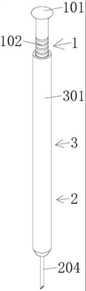 本实用新型涉及一种食品发酵微生物的接种器,包括推注结构、接种针和器杆,其中推注结构活动连接在器杆的内部,器杆内部的推注结构下方活动连接有接种针;推注结构包括等距卡槽杆和活塞,等距卡槽杆的下方与活塞固定连接;器杆包括橡胶卡环,橡胶卡环的内侧与等距卡槽杆活动连接。本实用新型的食品发酵微生物的接种器结构简单,操作方便,可自行消毒,可执行定量接种。