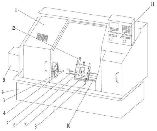 本发明公开了一种数控机床自动进料装置,包括机床主体、主轴装置、回转工作台、滑轨及数控系统,主轴装置设置在机床主体的左侧,所述滑轨对称设置在机床主体内部主轴装置的右侧,回转工作台设置在滑轨的上方;所述回转工作台包括可调整弹簧夹紧装置、刀具及钻头,所述可调整弹簧夹紧装置的一端设置在回转工作台的一侧面,刀具及钻头分别设置在回转工作台顶面的两侧;所述主轴装置及回转工作台与数控系统电连接。本发明的数控机床自动进料装置,实现了在数控机床上对标准件及异形棒料加工的自动送料、自动夹紧、自动切断的全程自动化,每个工件可节省停车和启动时间35秒钟,自动化程度极高,生产效率比人工装夹料数控机床工艺提高10倍。