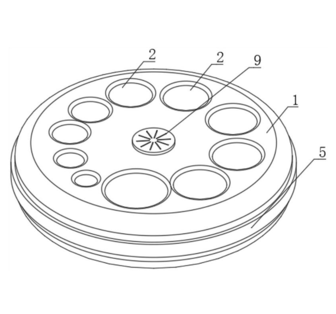 本实用新型公开了宫口扩张程度展示模型,属于宫口模型技术领域,包括模型套,模型套为圆饼形,模型套上贯穿开设有十个模型孔,模型孔沿着模型套的圆环方向均为分布,且模型孔的直径沿着模型套的圆环方向依次增大,模型套的内部设置有空腔,模型套的外圈处设置有防止模型套变形的限位机构。通过设置模型套和模型孔,每一个模型孔即代表宫口扩张程度的一个阶段,将宫口扩张各阶段的大小罗列于同一平面,能够帮助学生更直观地感受和比较,从而达到理解、记忆的目的,同时以柔软的布料和棉花进行制作,更贴近真实宫口的质感,并且轻巧便于搬运