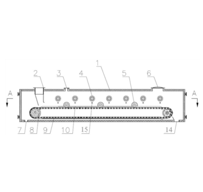 本实用新型公开了一种燃气热辐射式热解设备,属于热解技术领域。设备包括炉体,炉体内设有链板传动机构,链板传动机构的上方设有松料机构,松料机构上方设有热辐射机构,炉体上且位于链板传动机构的一端上方开设有进料口,炉体下侧远离进料口的一端开设有卸料口。本实用新型采用多个热辐射机构精准控制炉体腔内温度,热辐射机构包括热辐射管套和燃烧器,燃烧器可通过温度检测器的电信号,脉冲式加热热辐射管套,以热辐射的形式间接加热热解设备腔体,实现物料连续化处置,具备处理效果好、炉体寿命长、炉内温度精准可控、能耗低和产尘量少的优点