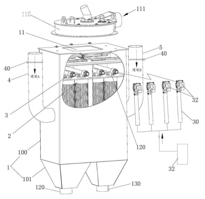 本发明公开了一种发动机用空气预过滤除尘装置及过滤除尘方法,包括主箱体、除尘过滤滤芯和吹气管组件,在主箱体的顶端内部分隔有出气缓冲腔体,在所述主箱体内且位于出气缓冲腔体下方分隔两个互不连通的第一过滤腔体和第二过滤腔体,在每个过滤腔体的内部上端与出气缓冲腔体的内部下端之间分别分隔有互不连通的第一吹气缓冲腔和第二吹气缓冲腔,在第一过滤腔体和第二过滤腔体分别设置多组除尘过滤滤芯,在主箱体上设置水平伸入第一吹气缓冲腔内和第二吹气缓冲腔内的吹气管组件,本发明按预设频率向除尘过滤滤芯内循环通入过滤空气和进行反吹气,实现循环过滤和除尘,并将大部分粉尘过滤掉,从而看延长设备的使用寿命