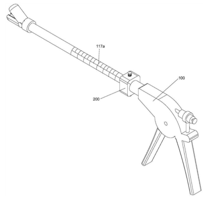 本实用新型涉及一种活检钳,具体地说,涉及一种可量度深度的活检钳。其包括固定装置和设置于固定装置一侧的定位装置,固定装置包括切割机构,切割机构的内部设有同步机构,切割机构包括固定板,固定板的顶端固定连接有伸入杆,伸入杆的内部开设有贯穿伸入杆的通槽。本实用新型设计在对患者的肿瘤进行切除之前能够将切割底座和切割块的位置固定住,避免其发生滑动导致对患者造成进一步伤害,同时在肿瘤处有液体堆积时能够直接将其吸取出来,不需要再使用吸取装置将其吸出来,大大减少医生对患者治疗时花费的时间,避免对患者造成额外伤害的同时减少治疗时间,提高治疗效果