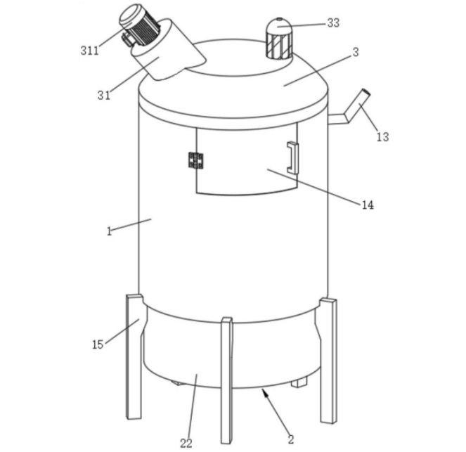 本实用新型涉及面食加工技术领域,具体地说,涉及一种用于加工面食的微生物发酵罐。其包括罐体和安装在罐体底部的加热机构,以及设置在罐体顶部的上盖,罐体内部设置有发酵仓,罐体四周内部设置有呈环形阵列的若干导流槽,底块固定在呈环形阵列的若干固定板的一端,若干固定板另一端固定在上连接板内壁上,连接板顶部固定连接在罐体底部,第一驱动电机输出端同轴连接有风扇,连接板顶部内壁设置有若干定位块。本实用新型设计,通过设置的加热机构包括的驱动电机驱动输出,使风扇转动产生气流,加热丝产出的热量被气流吹动,形成向上的气流并通过罐体内部的导流槽,将气流导向发酵仓上,并通过顶部排出形成循环,以保持面团中酵母发酵时的温度。