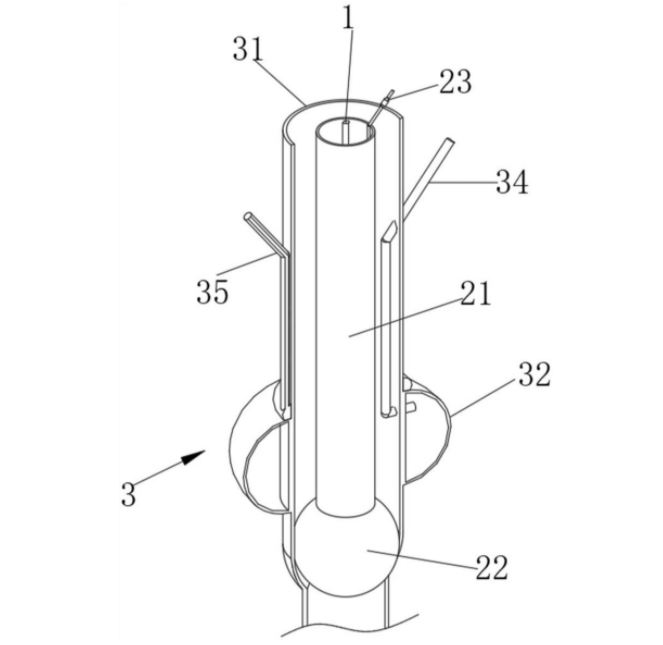 本实用新型涉及尿管插管技术领域,具体地说,涉及一种便于插管及防止尿道损伤的尿管。其包括双腔尿管,双腔尿管的内部设置有导丝套管,导丝套管的内部设置有导丝,导丝套管包括直管和固定在直管一端的气囊,气囊上连接有导气管,导丝设置在直管的内部,双腔尿管包括尿管,尿管的外侧壁上设置有水囊,水囊上连接有水囊管。本实用新型通过设置的导丝对导丝套管和双腔尿管进行引导,使导丝套管和双腔尿管在病人的尿道中移动,使降低尿管插入到尿道中的难度,同时在插入双腔尿管,尿道紧绷时,通过向药管中打入麻醉剂,让尿管松弛,使尿管顺利插入膀胱,提高前列腺增生患者插尿管的成功率。