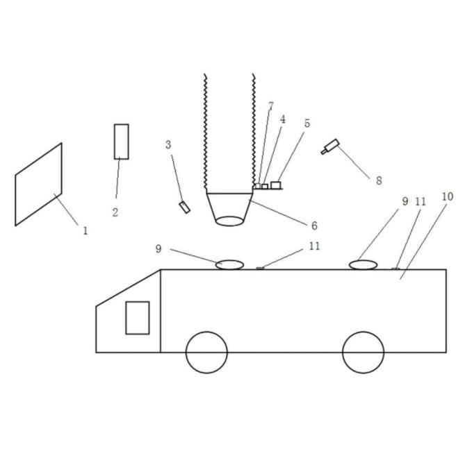 本实用新型提供一种散装水泥装车系统,属于水泥散装装车技术领域,包括下料机构和水泥车,下料机构设置在水泥车的上方,还包括显示屏、车盖检测开关、距离传感器、激光灯头、摄像头和车盖,车盖设置在水泥车的车厢顶部,显示屏设置在水泥车前方的墙体上,摄像头设置在水泥车的上方并倾斜设置,摄像头的照射口对准下料机构下方,下料机构设置在水泥车的上方。本实用新型能够快速地自动装车,减少人员劳动力,降低人员的安全风险,通过激光灯头发射激光与对准标记重合对准为校准下料机构与车盖对准,使得司机通过摄像头采集的视频显示在显示屏上,司机更容易调整对准位置,使得自动装车更快。